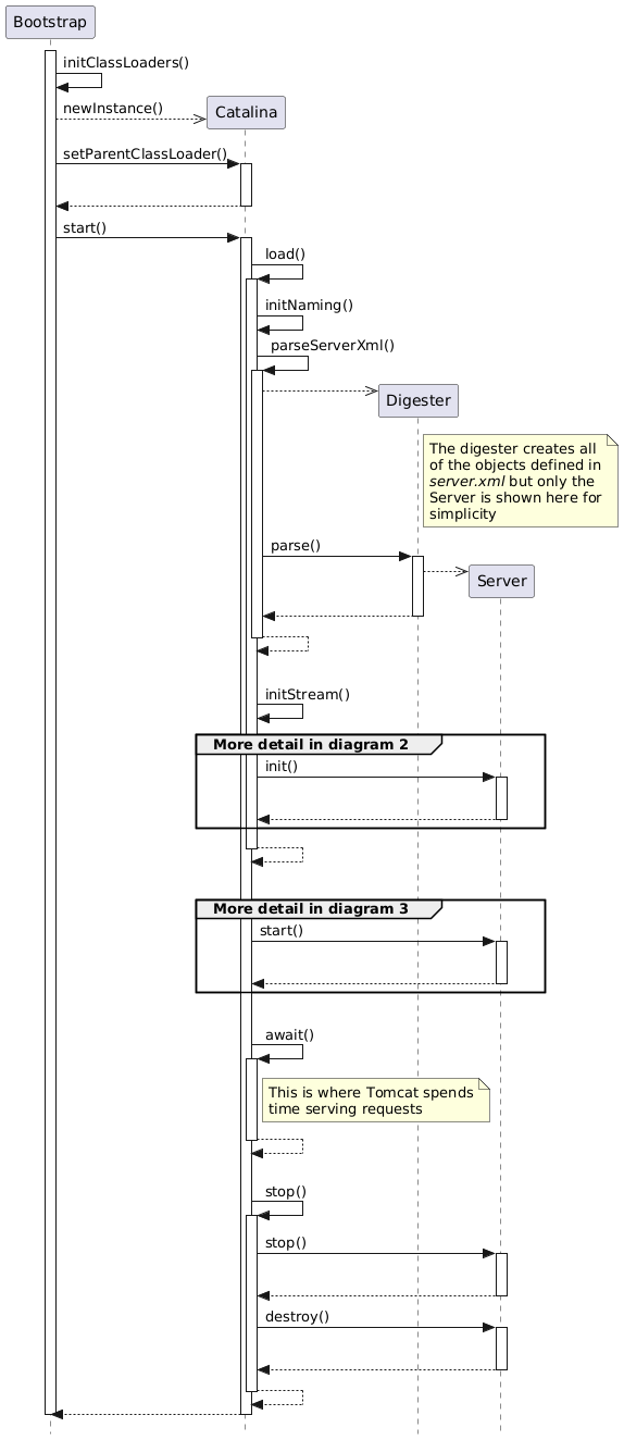 Diagram 1 shows an overview of how Tomcat start, serves requests and then stops. Once the class loaders have been initialized, Tomcat parses server.xml using the Digester and the Digester creates the objects defined in server.xml, configures them using the property values defined in server.xml and the starts the Server. The main Java thread waits in the await() method for a shutdown signal. Once a shutdown signal is received, the Server object is stopped and then destroyed. The JVM then exits.